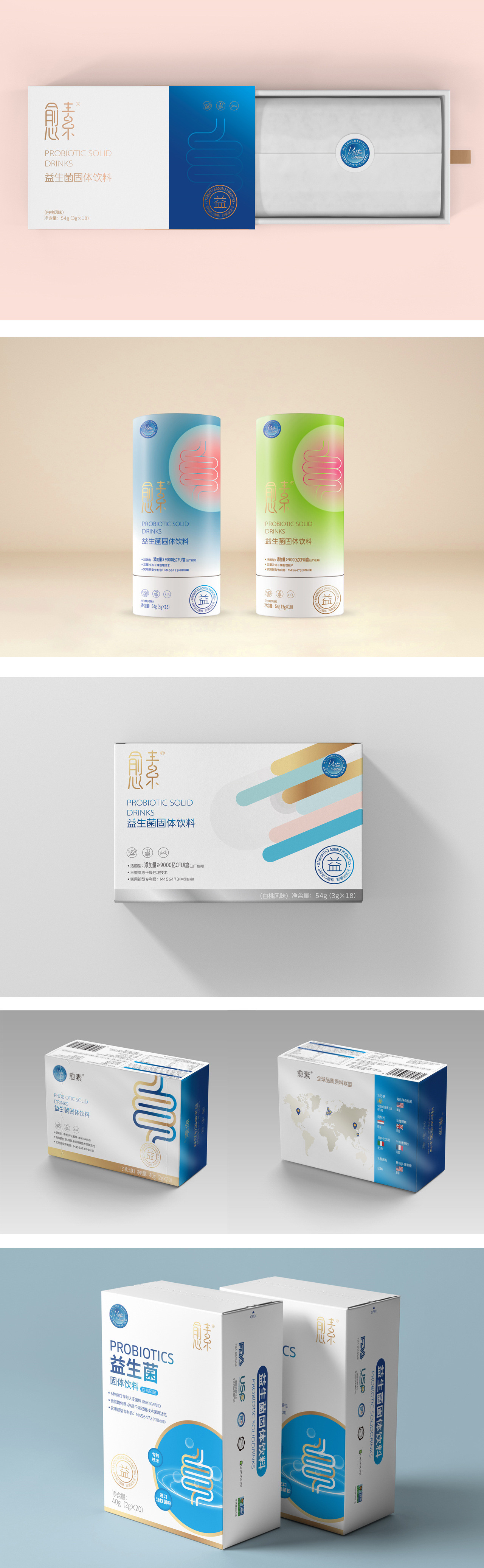 玛士撒拉(上海)医疗科技有限公司,是一家集研发、生产、销售于一体的大型医学营养科技型企业,此次包装设计是旗下品牌愈素的产品,益生菌固体饮料,主要用于调料肠胃,可医